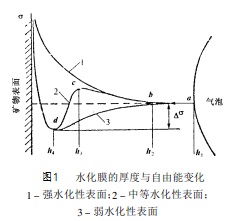 第二阶段b是矿粒与气泡的水化层接触。此时矿粒与气泡间的距离变化为h2。原来矿粒与气泡间的普通水层、由于矿粒与气泡的逼近,逐步从夹缝中被挤走,直到矿粒表面的水化层与气泡表面的水化层相互接触。由于水化层的水分子是在表面键能的作用力场范围内,故水分子偶极是定向排列的,这与普通水分子的无序排列不同。因此,要挤走水化层中的水分子,如图1曲线2中由b向c处推进时,就要外界向体系作功,才能克服b到c的能峰。