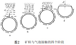 最后阶段d是矿粒与气泡接触。从情况c,自发进行到d,此时矿粒与气泡开始接触。接触发生后,如为疏水矿物,接触周边可能继续扩展。
